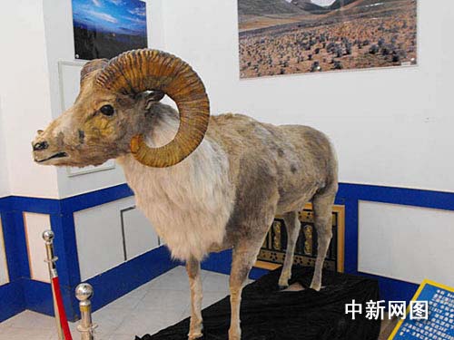 阿克塞哈薩克族自治縣縣委宣傳部熱提劍今日向記者介紹,該縣展覽館陳列的盤羊標本是國家二級保護動物,屬牛科中體型最大的一種,棲息于海拔2000——5000的沙漠和山地交界的沖擊平原和山地低溝中。雄性角粗大,由頭頂向下并向后螺旋狀彎曲,幾乎可達360度,主要分布在阿克塞哈薩克族自治縣境內于大、小哈爾騰前山和安南壩地區(qū)。