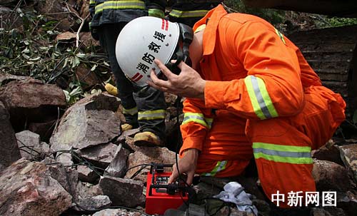 消防救援人員正在用生命探測儀進行搜救。