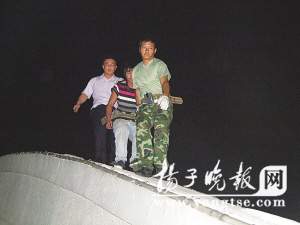 此時,丹陽市副市長、公安局長張劉茍獲悉后也火速趕到現場指揮救援。由于現場光線不足,救援人員只能模糊地看到高處男子的身影。為了防止男子做出不冷靜的動作,救援人員沒有貿然行動,而是在該男子可能掉下來的地方鋪設救生氣墊以及架設起10余張安全網。此時,在云陽大橋下的大運河中,聞警出動的水上派出所的搜救隊隊員也已穿好泳衣,隨時準備下水救人。海事部門、路燈管理所和120救援人員也被調集至現場,嚴陣待命,現場彌漫著緊張氣氛。