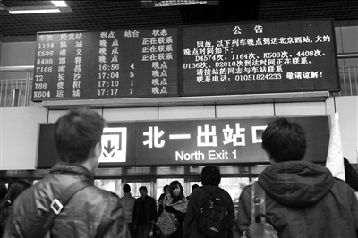 受10日以來石家莊暴雪影響,經京廣線進京的列車大面積晚點。昨天(11日),共有124趟進出北京西站的列車晚點,大量旅客的行程受到影響。為此,北京西站啟動應急響應,開放全部候車大廳,旅客可選擇全額退票。 昨天下午4點多,記者在北京西站進站大廳內看到,顯示屏上有17趟從西站始發的列車顯示為晚點,還有7趟列車未標明發車時間。在屏幕下方,滾動字幕顯示晚點列車信息。各個候車室外均增加了鐵路工作人員,負責維持秩序并做解釋工作。