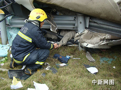 接警后,30多名消防救援人員迅速趕赴現場。10時13分許,救援人員趕到事故現場。一輛車牌為閩A25785的加長大貨車撞斷高速護欄后,側翻在路邊,車頭已經面目全非,車體嚴重扭曲變形,從車身外部清楚可見變形駕駛室與地面之間有一名男子被死死卡住,動彈不得,臉色蒼白,另一名人員被卡在駕駛室內,生死不明,情況十分緊急。而且側翻導致油箱破裂,油箱里的柴油已經流了一地,情況十分緊急,急需救援。