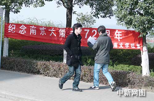 這條印有“紀念南京大屠殺72周年”字樣的條幅為一學生社團所掛。活動負責人李強說,在南京大屠殺72周年來臨之際他們開展了簽名、圖片展、演講比賽等系列活動。他說,用“紀念”這個詞很正常,沒有什么問題。