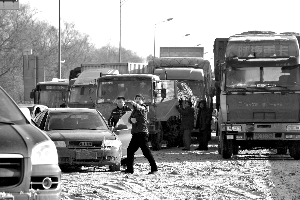 昨日下午1時,八達嶺高速路水屯出口處,出京方向,大貨車排成約20公里的長龍,前后看不到盡頭。由于長時間沒有挪動,一些司機或下車探路或在車上睡覺。交警介紹,目前水屯路口積雪清理完畢,車輛今日可完全疏散。據(jù)了解,累計數(shù)千輛大貨車因雪被困在此兩日夜。