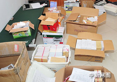 據(jù)悉,警方共奔赴13個(gè)抓捕點(diǎn)。記者在一個(gè)抓捕點(diǎn)看到,除了一張上下鋪鋼絲床,其余地方都被各類的紙箱占據(jù)。民警隨意打開地上的紙箱,里面都是各式各樣的假發(fā)票,不僅是浙江省范圍內(nèi)的,上海、山東、江蘇等地的假發(fā)票也隨地都是。經(jīng)清點(diǎn),民警一共繳獲各類假發(fā)票21.3萬份,同時(shí)還繳獲了3套電腦、打印機(jī)、掃描儀等印制發(fā)票用普通設(shè)備以及400余枚開具假發(fā)票所使用的偽造公章、假證等作案工具。