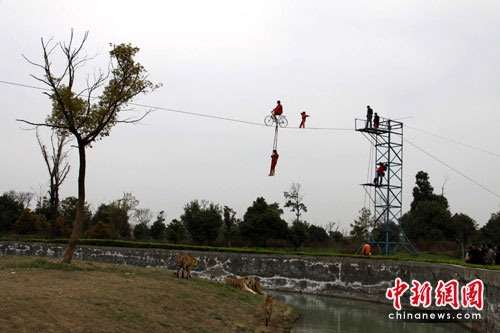 “小燕子”迅速調整姿勢、繼續前進,剛剛十步開外,最驚險的一幕出現了,園中的老虎似受到現場緊張氣氛的影響,突然顯得有些躁動不安,在鋼絲繩下來回走動,并警覺的看著上方的挑戰者“小燕子”,驚天動地般地呼嘯了兩聲后,成年公虎“阿彪”向著“小燕子”所在的上方跳去,差點碰到位于鋼絲下方領路的自行車扶梯上。同時,一只母虎試圖爬到附近的大樹上。“小燕子”一度陷入了老虎觸爪可及的危險境地,實在是讓現場觀眾為她捏了一把冷汗。鋼絲上,命懸一線的“小燕子”,在空中搖晃了幾下,停下來凝神吸氣,盡力控制住鋼絲不再晃動,一步一步向鋼絲另一端走去。終于,“小燕子”耗時近20分鐘,成功的完成挑戰,一舉突破50米,創造了自己新的紀錄,爾后空手走到自行車前“凱旋”,觀眾忍不住拍手叫絕。