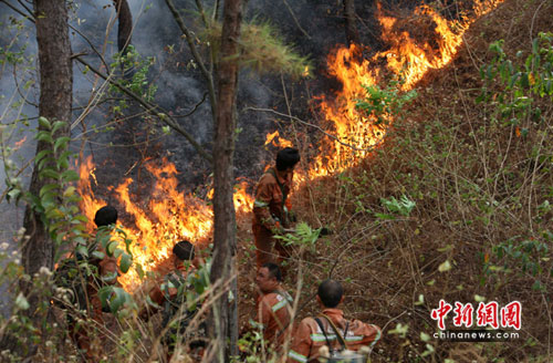 據(jù)當(dāng)?shù)卮迕窠榻B,大火是凌晨3:00左右從山梁處頂開始燃起,大火迅速蔓延開。火災(zāi)發(fā)生后,當(dāng)?shù)厝罕姄艽蛄嘶鹁娫挘捎谄鸹瘘c(diǎn)位于山頂,加上天未亮,給撲火工作帶來很大難度,趕到現(xiàn)場(chǎng)的攀枝花市仁和區(qū)地方森林撲火隊(duì)及森林武警60余人摸黑奮戰(zhàn),8:00左右,山火被成功控制。但由于當(dāng)?shù)匾延?87天無降雨過程,山上草木十分干燥。16時(shí)許,火星再次復(fù)燃引發(fā)山火,過火面積超過上百公頃。記者在現(xiàn)場(chǎng)看到,高高的大山,經(jīng)山火一燒后地面被披上了一層黑色的外衣,顯得十分猙獰。