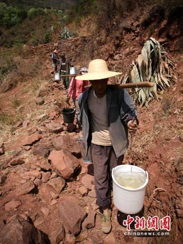 在忙碌的人群中一個佝僂的身影引起了記者的注意。那是80歲高齡且右腳患有輕微殘疾的殷蘭仙老人,她杵著拐杖沿著崎嶇的山路一步步地走到水源地。老人用記者不能完全聽明白的彝語說:“修了水窖,我們吃水也就方便了。我還能動,還可以出力,做些力所能及的活。多一個人,水窖就可以早點完工。”說到這里,老人的臉上流下了不知是喜悅還是無奈的淚水。(完)