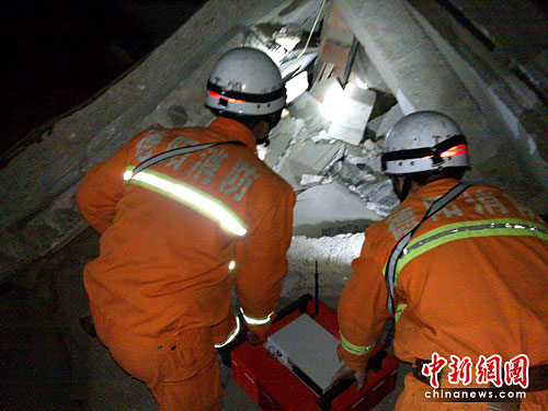 4月15日,玉樹縣結(jié)古鎮(zhèn)氣象賓館旁的民房,肖國平和白云飛的視頻生命探測儀發(fā)揮了作用。據(jù)群眾反應(yīng),這里有被埋人員,肖國平與白云飛立即就沖了上去。這幢民房整體坍塌,他們在廢墟里仔細探尋,殘垣斷壁露出的鐵釘、鋼筋、瓦礫讓他們行動困難,臉劃破了全然不顧。然而一分一秒過去了,儀器上遲遲沒有發(fā)現(xiàn)生命跡象,但他們沒有放棄,繼續(xù)將視頻探頭深入廢墟中,最終在一個倒塌的墻體下發(fā)現(xiàn)疑似人體的跡象。