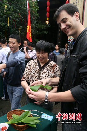 中新網(wǎng)重慶6月12日電 (孟幻)端午將至,包粽子、掛菖蒲……中國傳統(tǒng)習(xí)俗不能少。12日,匈牙利、柬埔寨等駐渝領(lǐng)事官員與20余個(gè)國家的留學(xué)生在重慶千年古鎮(zhèn)磁器口親手包粽子,與中國傳統(tǒng)習(xí)俗來了一次零距離接觸。