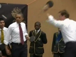 奧巴馬聯(lián)手英首相打乒乓 略顯笨拙不敵少年