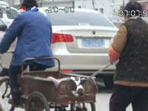 老人騎三輪 老伴用棍兒推
