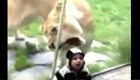 淡定寶寶透過玻璃墻與獅子打招呼