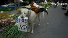 狗狗身背兩只雞口叼價格牌在市場擺攤