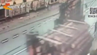監控實拍木材車轉彎太快砸中行人