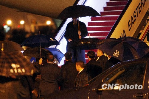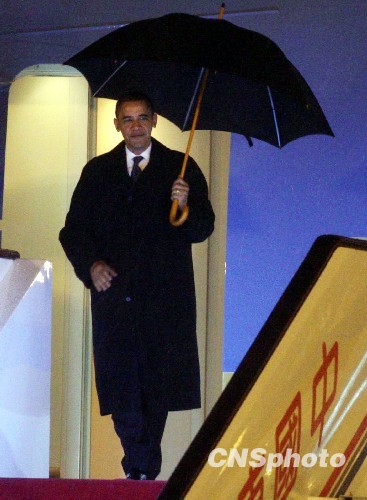 圖:美國總統奧巴馬抵達上海 記者雨中等候