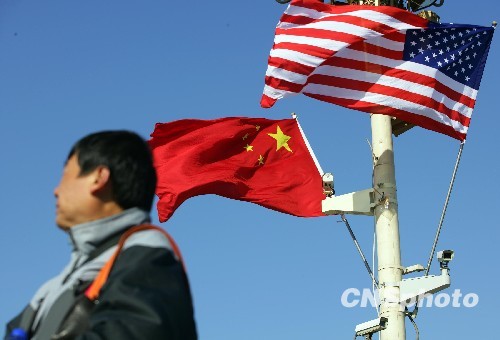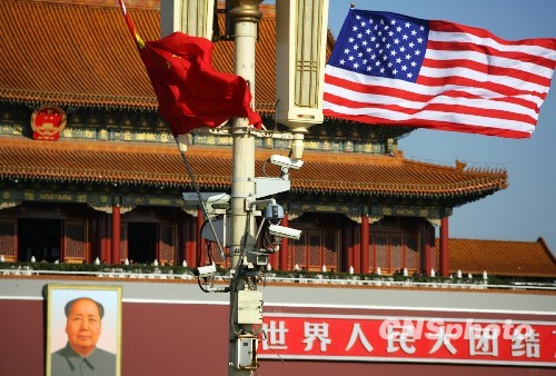 圖:中美兩國國旗天安門廣場共飄揚