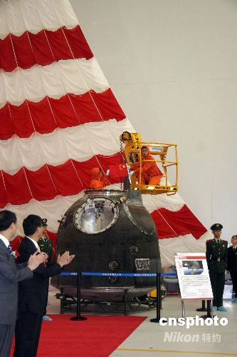 圖:“神七”載人飛船返回艙在北京舉行開艙儀式