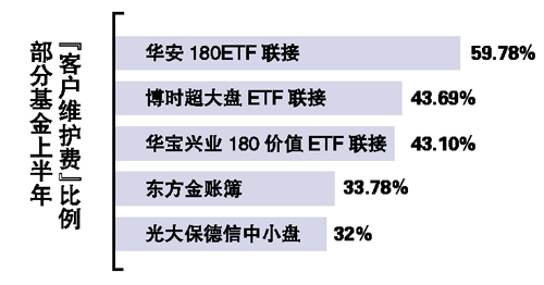 具體來看,18家已公布半年報的基金管理公司,上半年平均向渠道支出了13.76%的管理費用于“客戶維護”。其中,支出“客戶維護費”占其管理費收入最高的三家公司,分別為長信基金、東方基金、光大保德信基金,三家公司各自支出了自身管理費的23.61%、22.25%、20.98%用于“客戶維護”。而從單個基金出發,這個數據則更為驚人。整體來說,業內最高三至五成的費用支出比例仍然讓人咋舌。