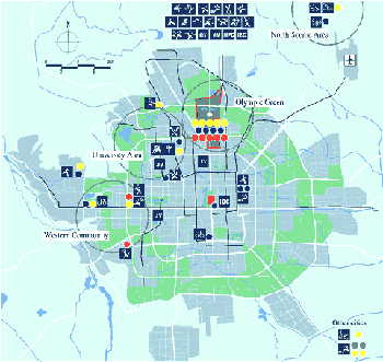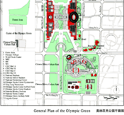可供16000名運動員、教練員及隨行人員居住,臨近主要比賽場館。 奧運村分為居住區和國際區,環境優美,舒適方便,安靜安全。 記者村:占地30公頃,建筑面積約40萬平方米,記者到達公園內的比賽場館,時間不超過6分鐘。 |