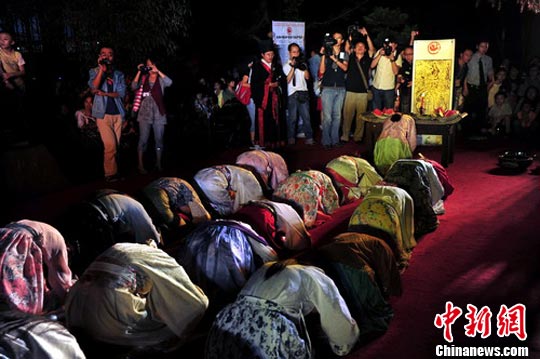 中秋之夜,大雅堂前,多名身著唐裝的美女,“經坐”(即雅坐)于席上,行祭拜禮,主祭者“三上香”后,念誦祭月祝文。拜月禮成后,祭拜人員和全體觀眾分食月餅、供果等祭品,宴飲賞月。“品月食以賞花,飛羽觴而醉月。”