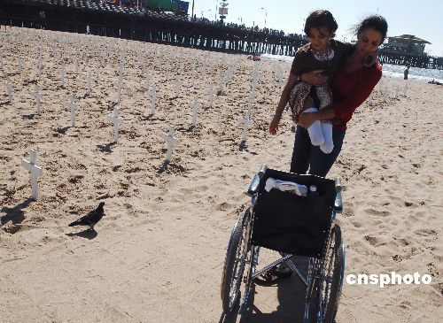 被戰火奪去雙腿的十歲伊拉克女孩薩利·阿拉維,十月中旬來到美國洛杉磯最美麗海灘之一的圣塔莫尼卡,訪美五天里為同樣在戰爭中受重傷的姐姐籌集治療款。她去年十一月七日與哥哥姐姐和朋友們在家門口玩耍時遭到導彈襲擊,哥哥當場被爆炸奪去生命,姐姐腿部受到重傷。中新社發 賈國榮 攝