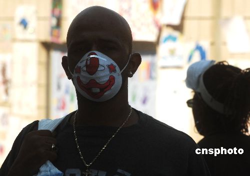 美國南加州大火十月二十八日主要在圣地亞哥山區(qū)已控制住,但官方估計至今還有一萬二千戶家庭受到火災威脅。圖為圣地亞哥民眾因空氣煙塵污染都戴上口罩上街。中新社發(fā) 賈國榮 攝