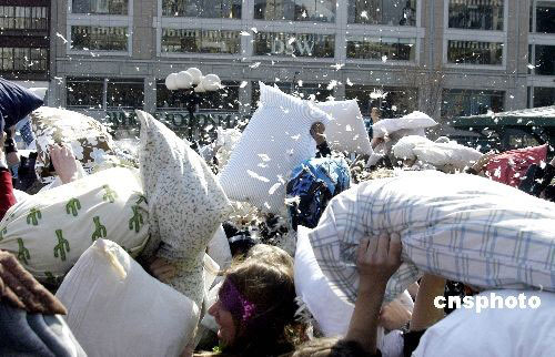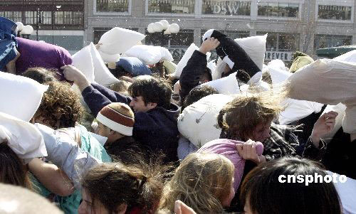 3月22日,紐約數百名青年聚居在曼哈頓聯合廣場展開一年一度的枕頭大戰。大家用睡了一個冬天的枕頭將彼此“砸醒”,笑迎春天的到來。中新社發 鄧悅 攝
