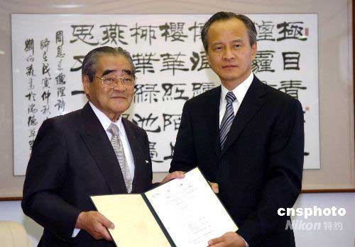 6月10日,日本永旺集團名譽會長岡田卓也親赴中國駐日使館向崔天凱大使免呈了向四川地震災區捐贈1億6千9百余萬日元的捐款書。據悉,這筆捐款是自四川地震發生以來日本使館迄今為止收到的數額最大的單筆捐款,其中近一半的捐款約八千四百多萬日元為日本普通消費者的捐贈。圖為崔天凱大使接受岡田卓也會長的捐款目錄。中新社發 朱沿華 攝