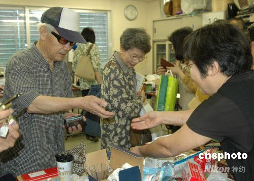 6月21日下午,在日中友好會館學習漢語的日本友人為支援中國四川大地震災區重建家園,發起并舉辦賑災義賣活動。他們將家里閑置的書籍、廚具、衣物、玩具等以非常便宜的價錢賣出,所得全部收益都將捐給四川大地震災區。圖為一日本老伯選購兩大袋物品后付錢給賣家。中新社發 關妍 攝