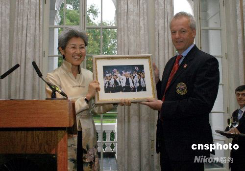 當(dāng)?shù)貢r(shí)間17日晚,中國(guó)駐英使館在倫敦文華東方酒店舉辦招待會(huì),慶祝北京奧運(yùn)會(huì)和殘奧會(huì)的閉幕。圖為中國(guó)駐英大使傅瑩(左)向英國(guó)奧委會(huì)首席執(zhí)行官西蒙·克萊格贈(zèng)送英國(guó)隊(duì)進(jìn)入鳥巢體育場(chǎng)時(shí)的照片。 中新社發(fā) 李鵬 攝