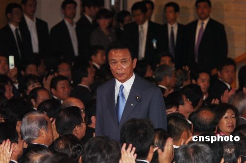 9月22日下午,日本自民黨總裁選舉中,第4次參選的麻生太郎以351票的高票當選該黨第23任總裁。中新社發(fā) 朱沿華 攝