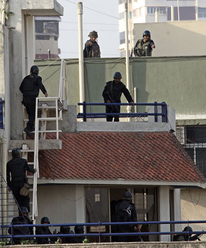 11月28日,在印度孟買,印度突擊隊員從武裝直升機上空降到納里曼大樓的樓頂。印度警方證實,印度軍警已經(jīng)從孟買市內(nèi)猶太人聚居的納里曼大樓中解救出7名人質(zhì),其中包括2名外國人,但目前還有多名人質(zhì)在武裝分子手中。