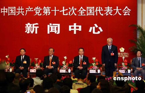 中共十七大新聞中心10月18日晚邀請(qǐng)五位中共黨員部長(zhǎng)聯(lián)合接受記者采訪。從左至右依次為教育部部長(zhǎng)周濟(jì)、衛(wèi)生部常務(wù)副部長(zhǎng)高強(qiáng)、勞動(dòng)和社會(huì)保障部部長(zhǎng)田成平、民政部部長(zhǎng)李學(xué)舉和建設(shè)部副部長(zhǎng)仇保興。中新社發(fā) 任晨鳴 攝