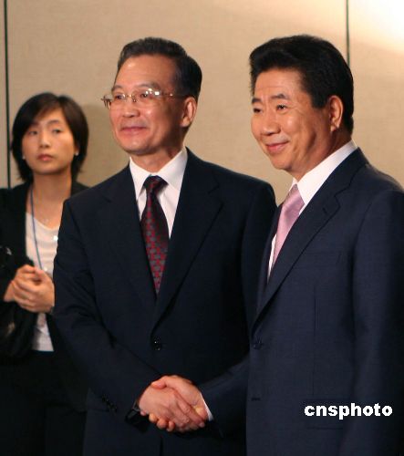 中國國務院總理溫家寶十一月二十日上午在新加坡會見韓國總統(tǒng)盧武鉉。溫家寶表示,中韓在半島及東北亞地區(qū)有著廣泛的共同利益。中方愿繼續(xù)保持同韓方的溝通和配合,共同推動半島無核化進程不斷取得新進展。中方將一如既往地堅定支持南北和解合作進程,將積極參與半島和平機制的建立。中新社發(fā) 周群 攝