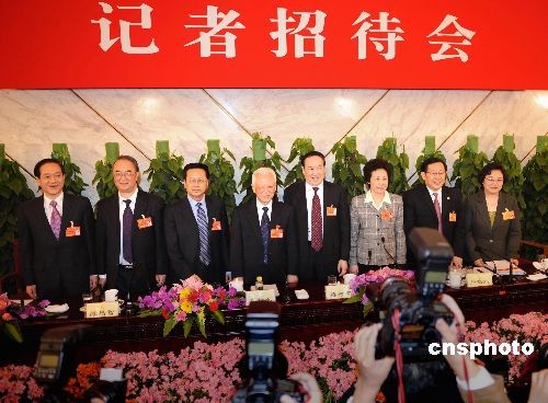 三月六日下午,全國政協十一屆一次會議記者招待會在北京人民大會堂新聞發布廳舉行,主題是“民主黨派中央主席談多黨合作”。九三學社中央主席韓啟德、農工黨中央主席桑國衛、民建中央主席陳昌智、民革中央主席周鐵農、民盟中央主席蔣樹聲、民進中央主席嚴雋琪、致公黨中央主席萬鋼、臺盟中央主席林文漪(從左至右)共同亮相,受到中外媒體的熱烈關注。中新社發 廖攀 攝