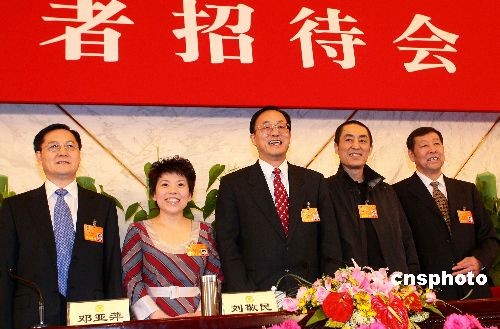 3月12日,全國政協十一屆一次會議記者招待會在北京人民大會堂新聞發布廳舉行,主題是“政協委員談奧運”。北京市副市長、北京奧組委執行副主席劉敬民(左三),國家體育總局副局長崔大林(右一),科技日報社社長張景安(左一),著名導演、北京奧組委開幕式總導演張藝謀(右二),前乒乓球世界冠軍、北京奧組委奧運村部副部長鄧亞萍(左二)等五位全國政協委員出席記者招待會,并回答記者問題。中新社發 盛佳鵬 攝