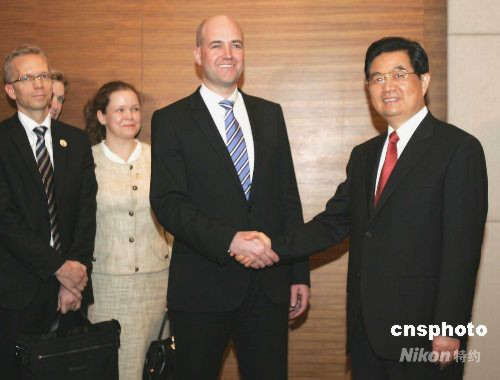 4月12日下午,海南省博鰲,中國國家主席胡錦濤會見來華訪問并出席博鰲亞洲論壇2008年年會開幕式的瑞典首相弗雷德里克·賴因費爾特以及隨行人員。中新社發 任晨鳴 攝