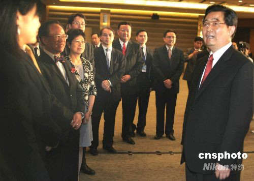 4月12日下午,國家主席胡錦濤在海南省博鰲專門會見出席博鰲亞洲論壇2008年會的香港、澳門企業(yè)家,并向大家表示問候。中新社發(fā) 任晨鳴 攝