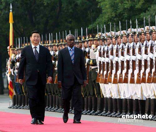 中國國家副主席習近平,6月10日在北京人民大會堂外廣場舉行儀式,歡迎蘇丹共和國副總統阿里·奧斯曼·穆罕默德·塔哈訪華。應習近平邀請,蘇丹共和國副總統阿里·奧斯曼·穆罕默德·塔哈于6月9日至15日對中國進行正式訪問。中新社發 任晨鳴 攝