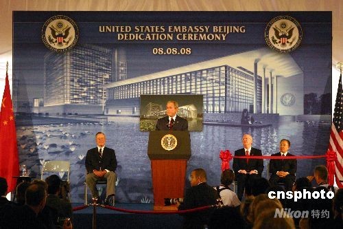 八月八日,美國駐華大使館舉行了隆重的新館開館儀式,前來出席北京奧運會開幕式的美國總統布什、前總統老布什,以及中國國務委員戴秉國出席儀式并致辭。中新社發 阮煜琳 攝