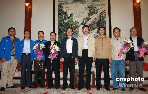9月26日,在酒泉衛星發射中心完成“神舟七號”發射任務后,北京航天科技集團運載火箭研究院第一批航天工作者返京,北京火箭專家機場在機場接待廳里與航天工作者合影留念。中新社發 鄭雄增 攝