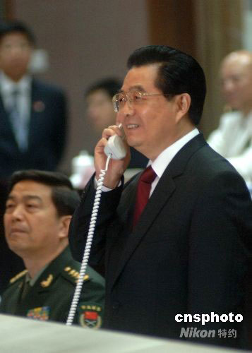 九月二十七日下午,神舟七號載人飛船翟志剛等三名航天員成功完成中國首次太空出艙活動后,親臨北京航天飛行控制中心觀看中國人這一歷史性壯舉的中共中央總書記、國家主席、中央軍委主席胡錦濤,與航天員們進行了天地通話。中新社發 張桐勝 攝
