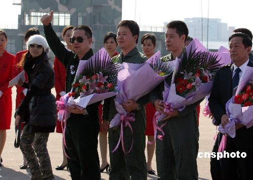 11月28日,中國首架自主研制、擁有完全自主知識產權的新型渦扇支線客機ARJ21-700飛機在上海成功首飛,三名試飛員凱旋歸來受到熱烈歡迎。圖為駕駛飛機的試飛員趙鵬豎起大拇指贊嘆ARJ21-700飛機此次完美的首飛藍天之旅。中新社發 孫自法 攝