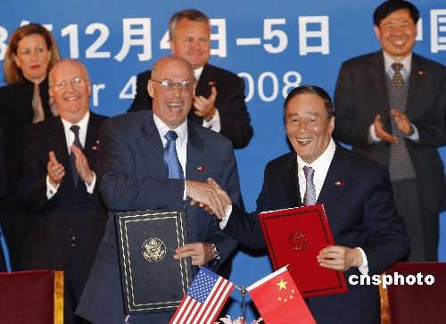 12月4日,在第五次中美戰(zhàn)略經(jīng)濟對話期間,中美能源環(huán)境十年合作框架下綠色合作伙伴計劃的相關(guān)簽字儀式在北京釣魚臺國賓館舉行。中國國務(wù)院副總理王岐山與美國財政部長保爾森分別代表中美兩國政府簽署了《中美能源環(huán)境十年合作框架下的綠色合作伙伴計劃框架》,并出席了相關(guān)合作意向書的簽字儀式。中新社發(fā) 盛佳鵬 攝