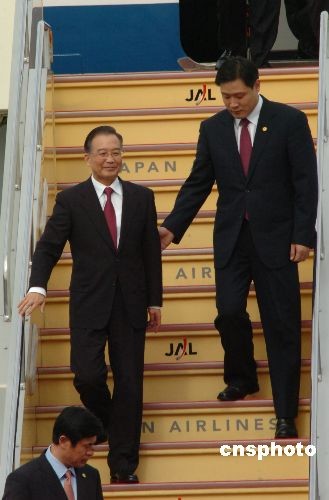 當地時間12月13日上午11點20分許,中國總理溫家寶抵達福岡機場準備出席即將舉行的中日韓三國領導人會議,受到數十位當地華人華僑的熱烈歡迎。中新社發 朱沿華 攝