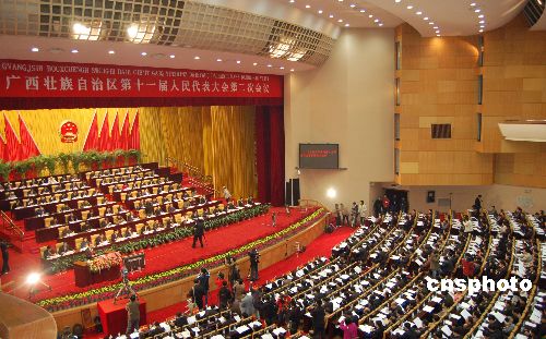 1月10日,為期五天的廣西壯族自治區(qū)十一屆人大二次會議在廣西首府南寧開幕。廣西壯族自治區(qū)主席馬飚在大會上做政府工作報告。中新社發(fā) 劉萬強 攝