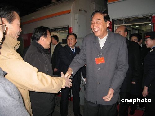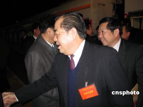 3月2日6:02分,來自河南的全國人大代表抵達北京,成為首批抵京參加十一屆全國人大二次會議的京外代表。圖為在站臺受到熱烈歡迎的河南省全國人大代表。中新社發 石雨 攝