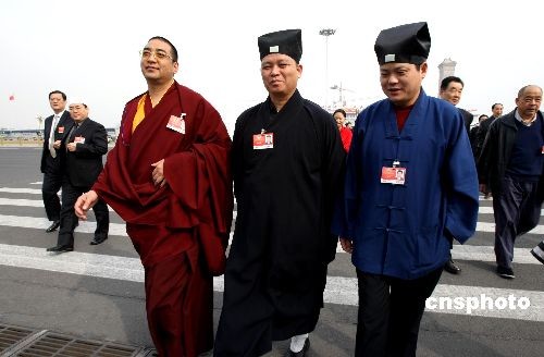 3月7日,全國政協十一屆二次會議舉行第二次全體會議,宗教界人士早早抵達人民大會堂。中新社發 傅丹丹 攝