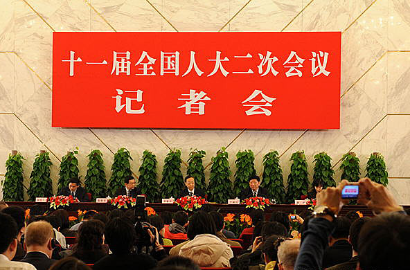 3月10日,十一屆全國人大二次會議舉行記者會,工業和信息化部部長李毅中、人力資源和社會保障部部長尹蔚民、商務部部長陳德銘答記者問。陳樹根 攝