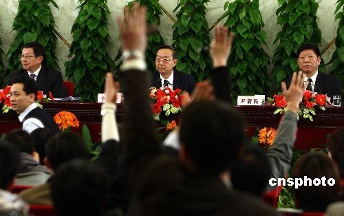 3月10日,十一屆全國人大二次會議在人民大會堂舉行記者會,工業和信息化部部長李毅中(中)、人力資源和社會保障部部長尹蔚民(右)、商務部部長陳德銘(左)就“擴內需、促就業、保增長”答記者問。中新社發 杜洋 攝